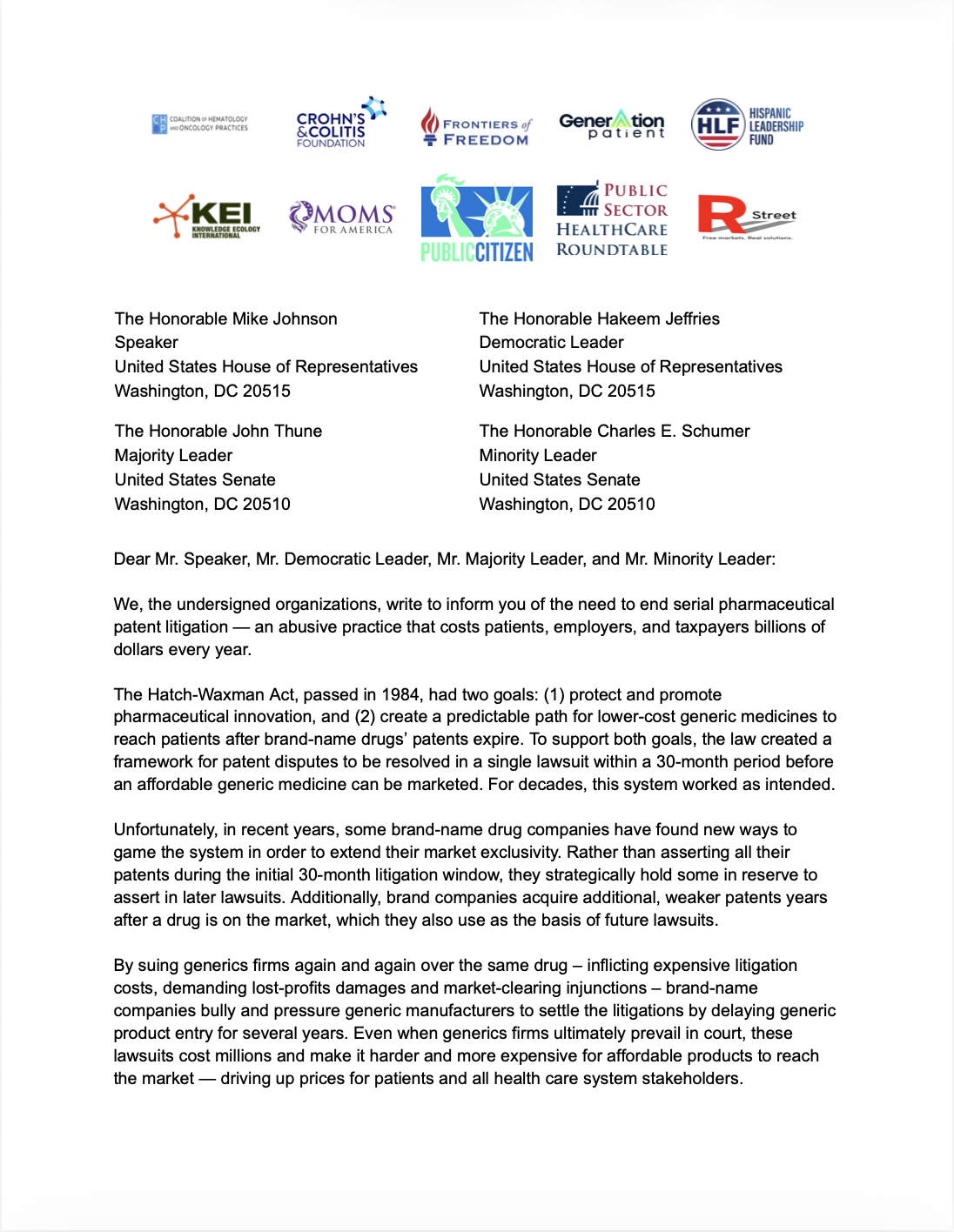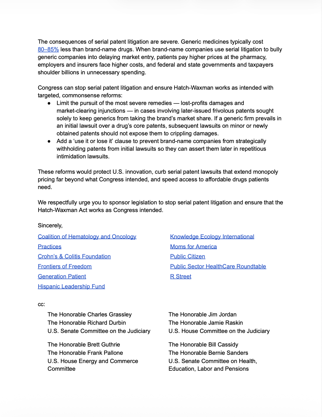 10 Organizations Sign Letter to Congress Calling for Patent Reform